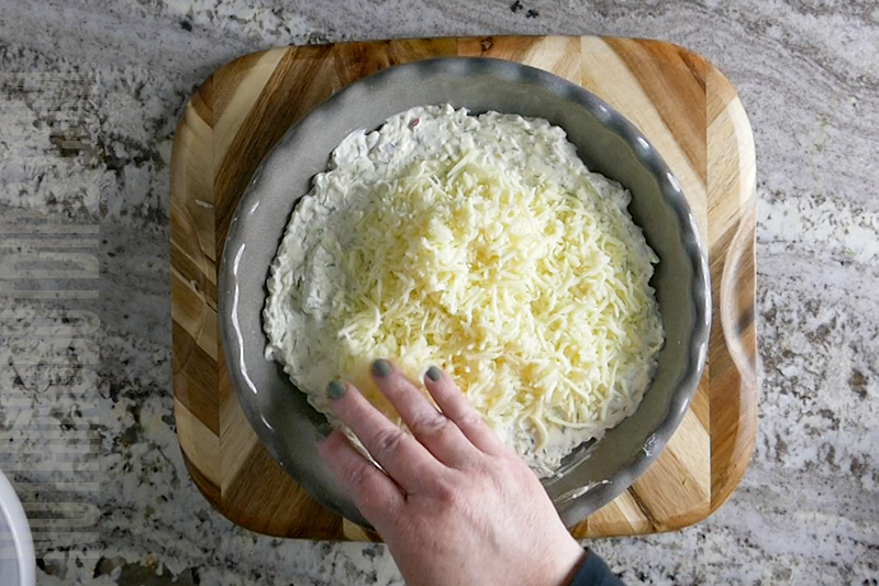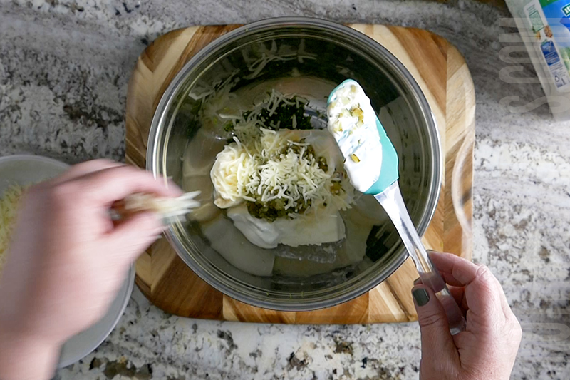 • To a bowl, add the softened cream cheese, sour cream, mayo, dill pickle relish, ½ cup mozzarella, ranch seasoning and salt & pepper to taste.