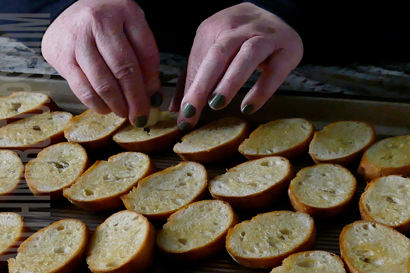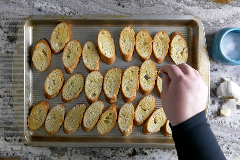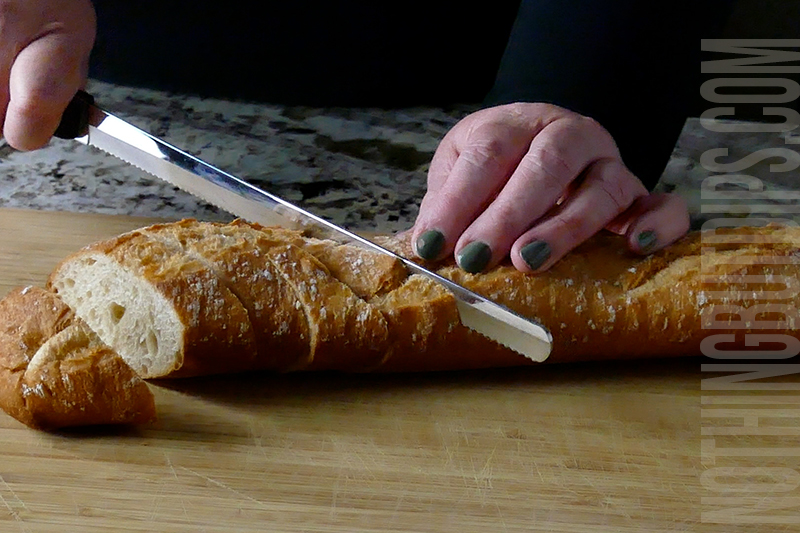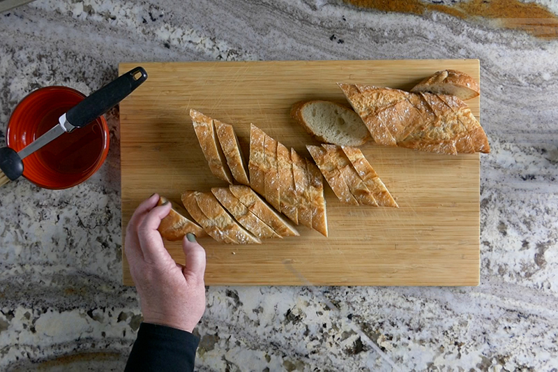 - Slice the French baguette into ½ inch slices, cutting on an angle.