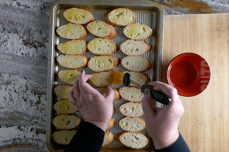 - Pour some olive oil into a bowl and use a pastry brush to brush oil onto one side of the bread pieces