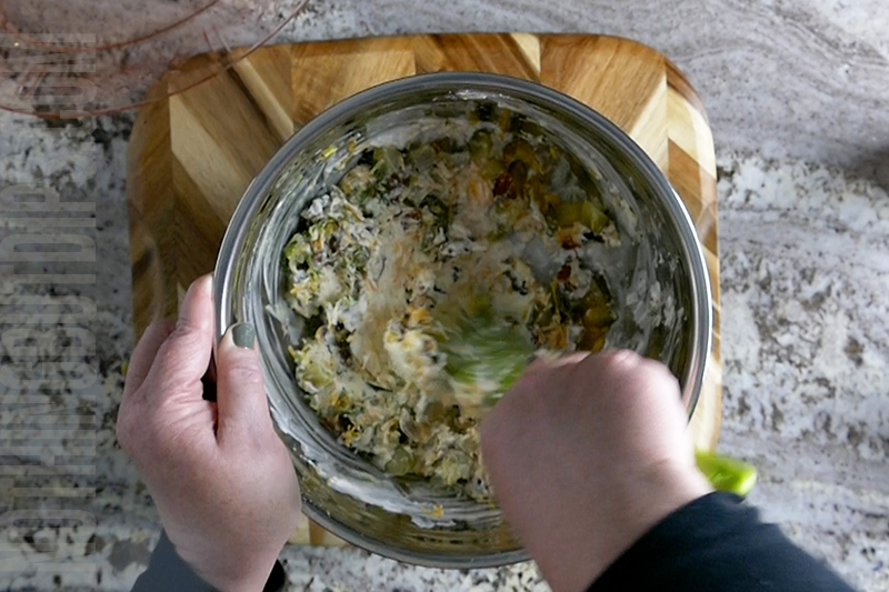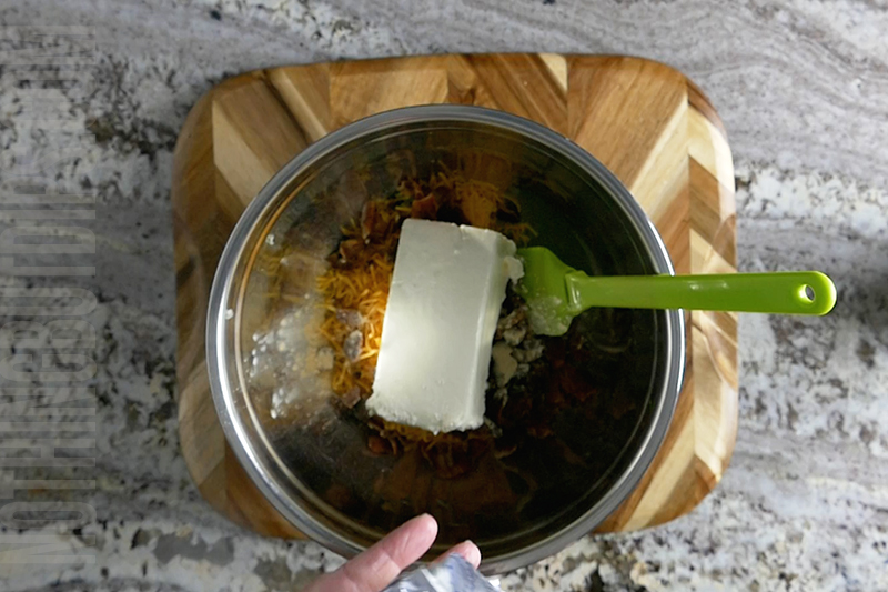 - Then add the cream cheese, sour cream, garlic powder, onion powder, 2 Tbsp dill juice, bacon, shredded cheddar and hot sauce (optional) to the bowl.