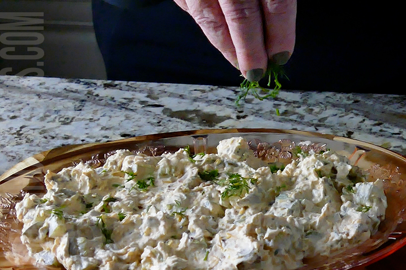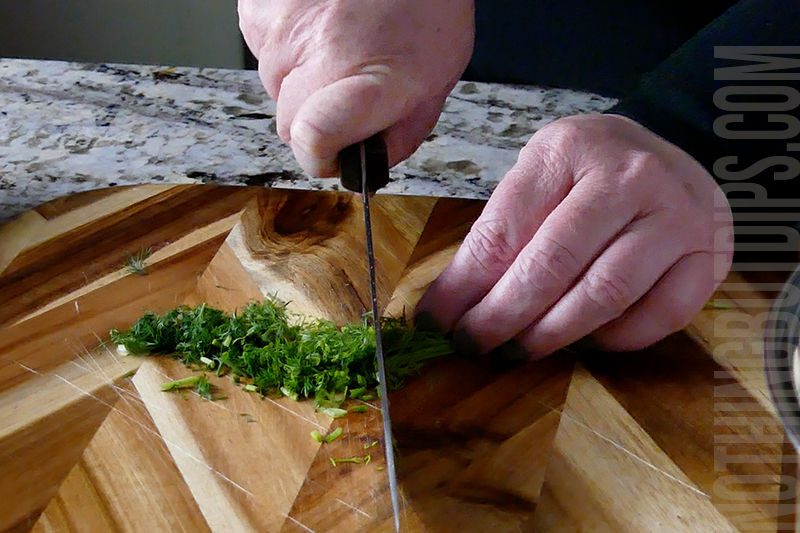 - Chop the dill finely and add it to a bowl. Reserve a small amount for garnishing.