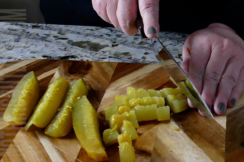- Take about half of the pickles from the jar and pat them dry. Dice them into 1-inch pieces and add them to the bowl.