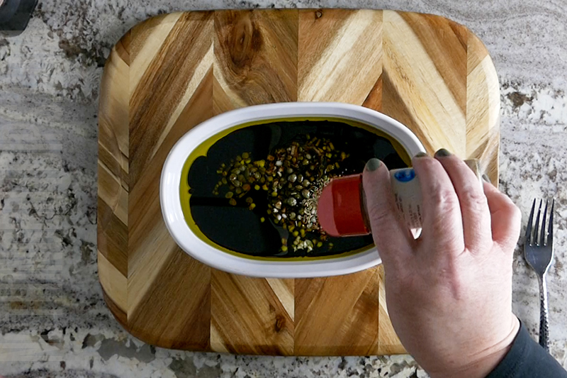 • Balsamic vinegar: This dark and intense vinegar is the perfect pair with olive oil as the base for this dipping oil. It’s both sweet and acidic and absolutely delicious.