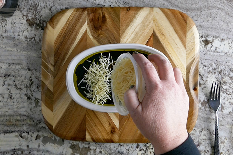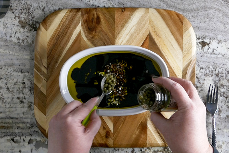 2. To the dish, add the minced garlic, basil paste, Italian seasoning, capers and grated parmesan cheese.
