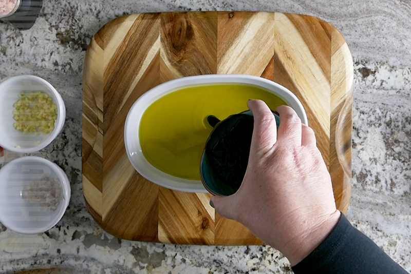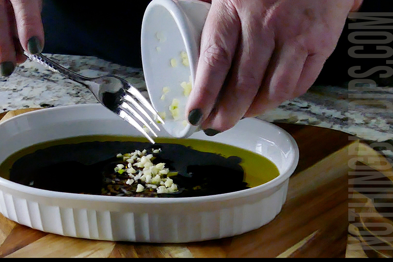 1. In a shallow dish, combine the olive oil and balsamic vinegar.