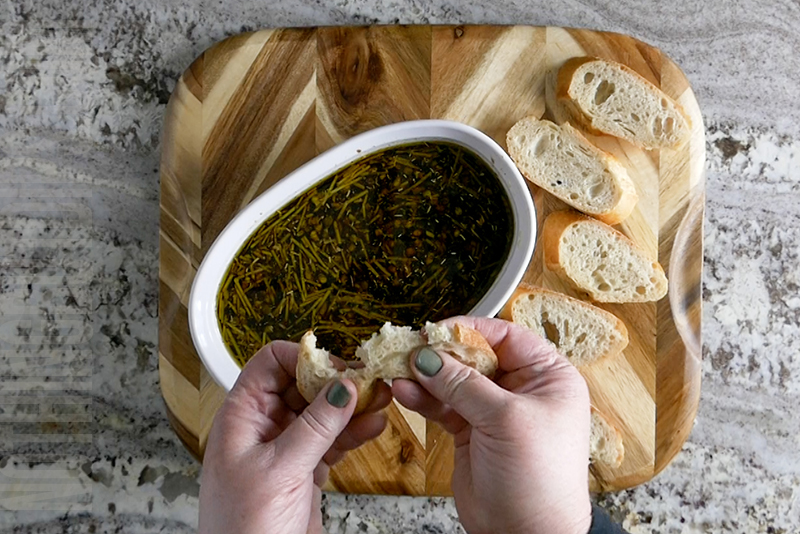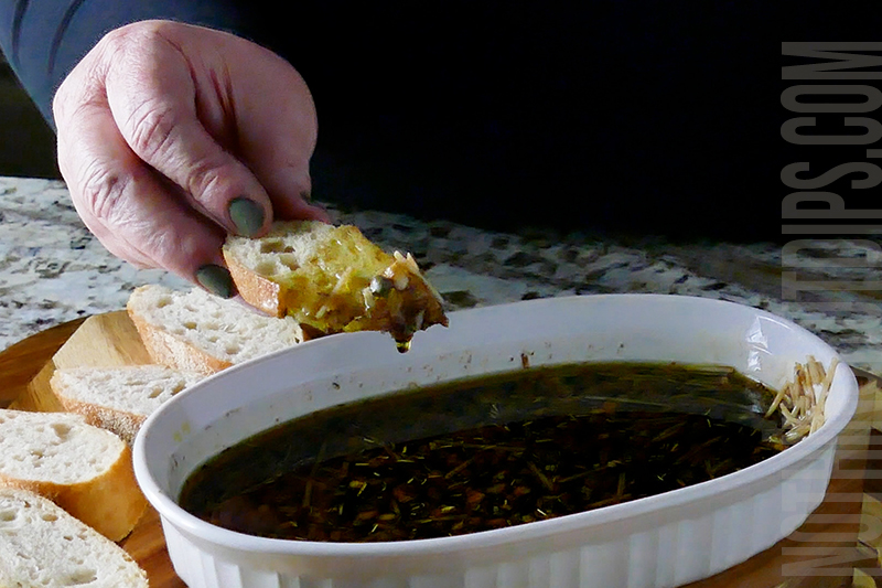 • Additions: There are so many things that you can add to your bread dipping oil. For example, try finely minced green or kalamata olives, finely minced sun dried tomatoes, fresh or dried thyme, fresh or dried rosemary, red pepper flakes, parsley, garlic powder, onion powder, lemon, anchovy paste, honey or pesto.