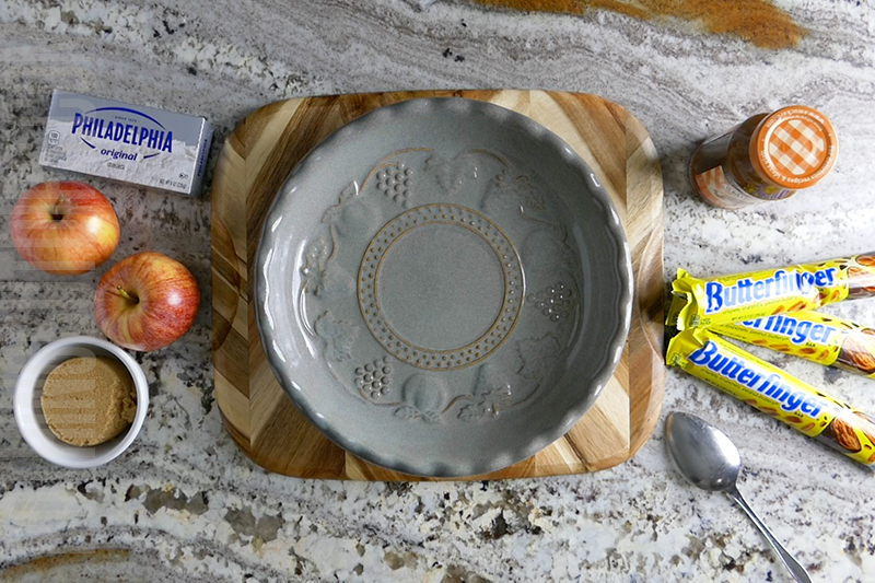 - Place cream cheese and brown sugar into a standard pie dish.