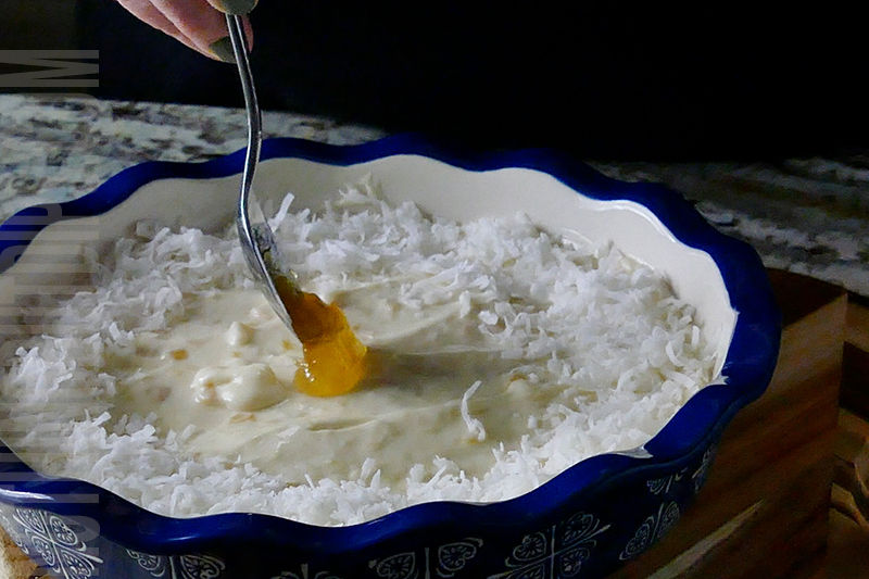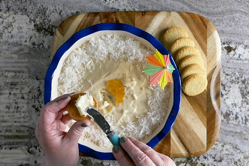 - Rim the top of the dip with the coconut and place the reserved dollop of pineapple preserves in the center.