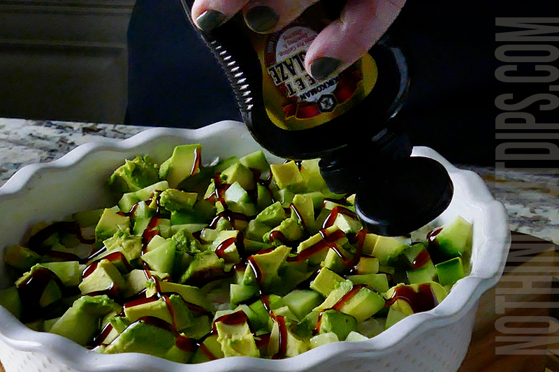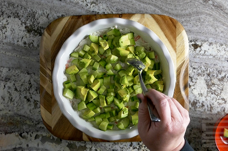 5. Dice the avocado and cucumber into ¼ inch pieces and add to the top of the mixture.