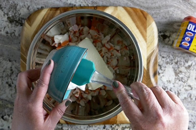 1. Shred the imitation crab meat and add it to a mixing bowl.
