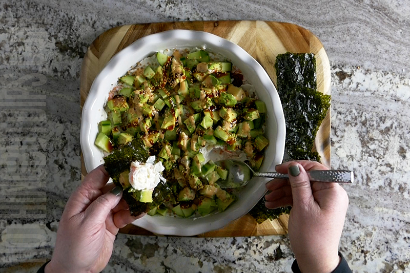 • Heat level: To make this a spicy sushi dip, add some wasabi to the base. Then top with a spicy drizzle and hot peppers.