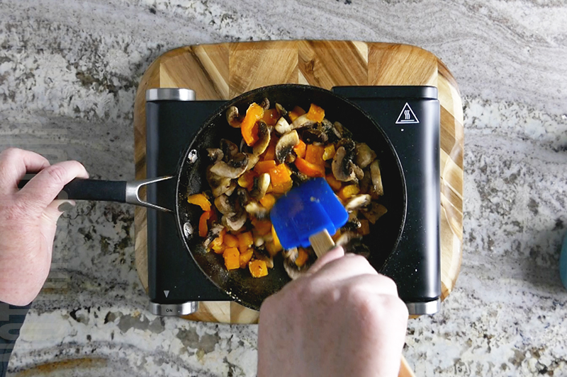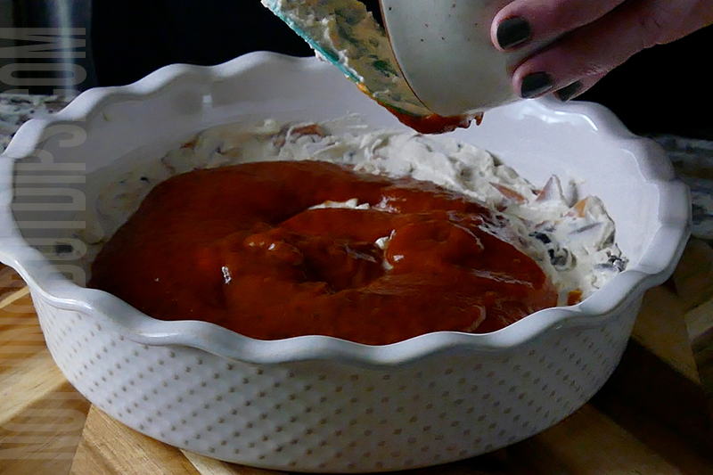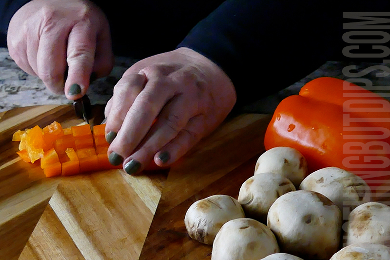 2. Prepare any other toppings you want to include in your pepperoni pizza dip. We chose mushrooms and sweet peppers, using ½ cup of each. Chop the toppings and saute in olive oil until soft. Reserve a bit for garnishing the top of the dip.