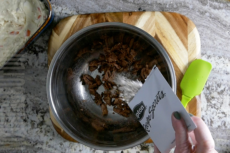 - In another bowl, mix the shredded pot roast and Lipton soup mix.