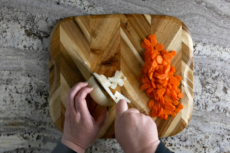 - Not pictured: Cooking the carrots and onions is not pictured, but I think you can handle it without the hand holding. Just add butter to a pan over medium heat. Toss in the diced carrots and onions, season with salt and pepper and cook until soft and onions are translucent.